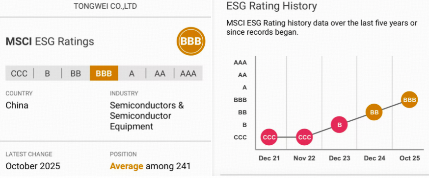 近期,国际权威指数机构摩根士丹利资本国际公司(简称明晟、MSCI)发布通威股份2025年度环境、社会及治理(ESG)评级结果。公司凭借在ESG方面的优异表现,最新评级上调至BBB级,实现了每年一级、稳步攀升。