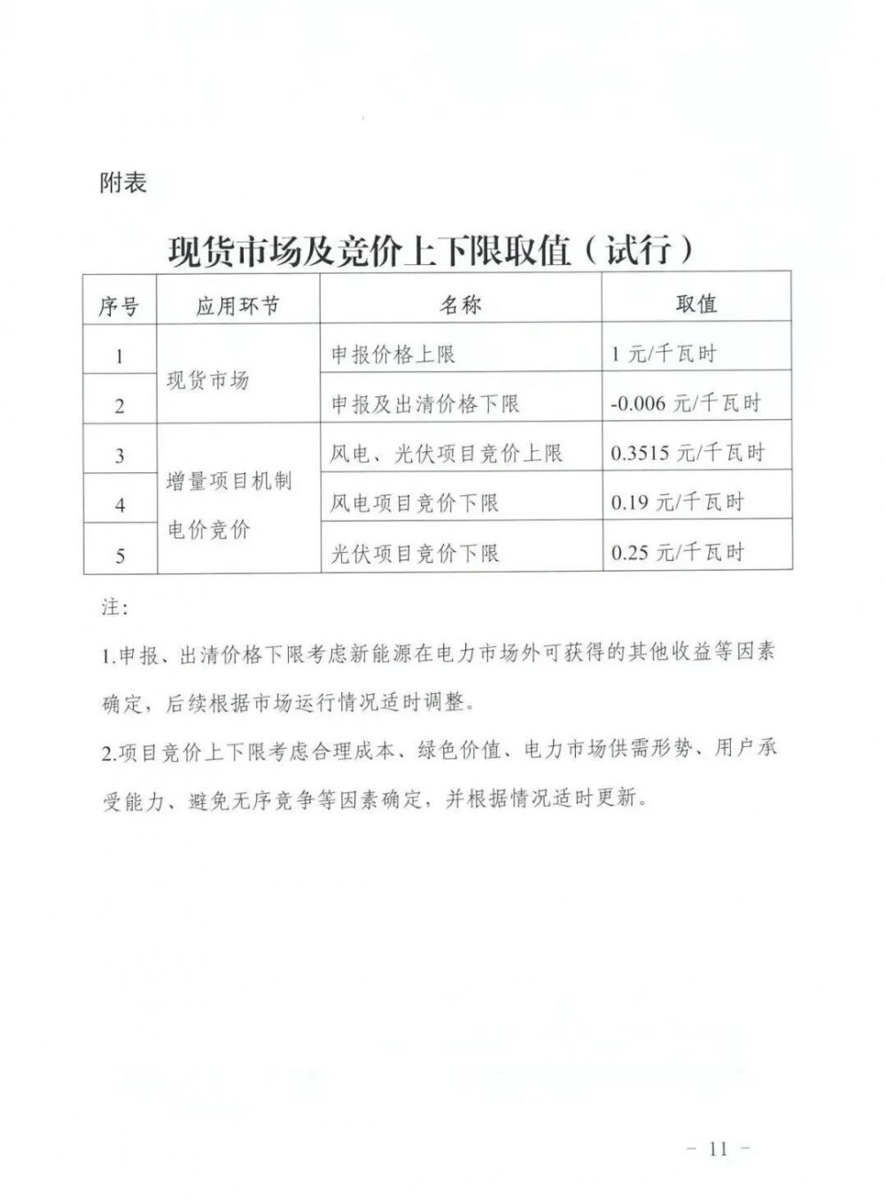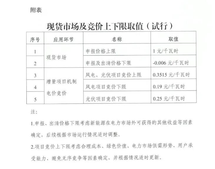 同时,适当放宽现货市场限价。贵州省增量新能源项目机制电价竞价上下限分别为:风电:0.19~0.3515元/kWh;光伏:0.25~0.3515元/kWh。