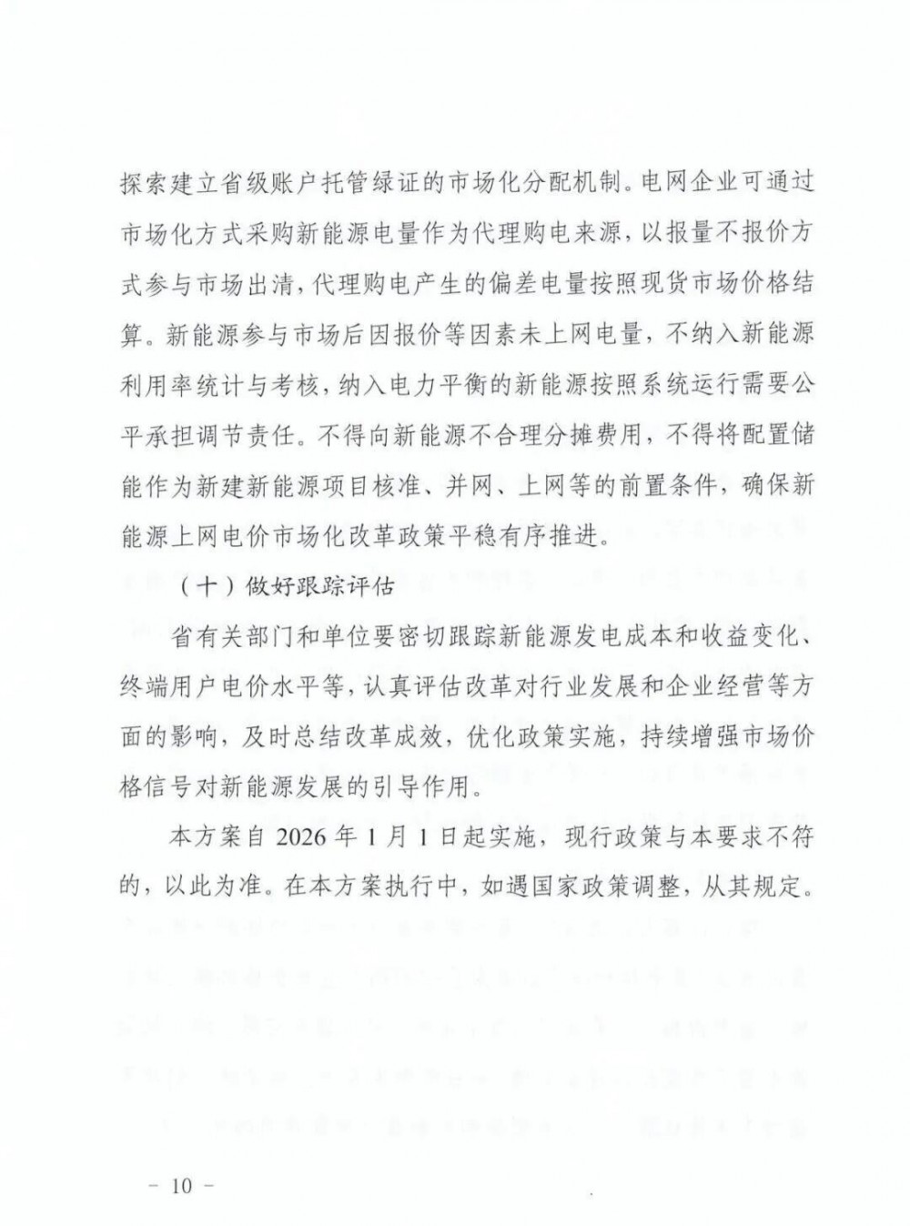 电量规模,2025年首次竞价电量规模与2024年新能源非市场化比例适当衔接,具体规模在细则中予以明确。此后,我省每年根据国家下达的年度非水电可再生能源电力消纳责任权重完成情况,以及用户承受能力等因素动态调整,并在竞价前予以公布。超出消纳责任权重的,次年纳入机制的电量规模可适当减少;未完成的,次年纳入机制的电量规模可适当增加。单个项目申请纳入机制的电量,不得超过其当期全部上网电量的90%。对于竞价周期内已签约的中长期交易电量、绿电电量,相应调减竞价申报比例上限。