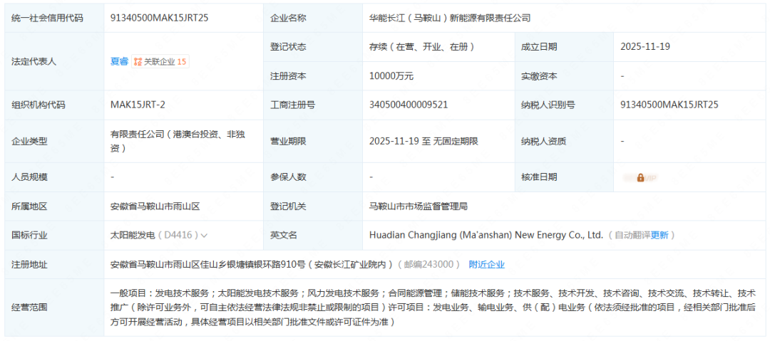光伏头条获悉,企查查显示,近日,华能长江(马鞍山)新能源有限责任公司成立,法定代表人为夏睿,注册资本为1亿元,经营范围包含:发电技术服务;太阳能发电技术服务;风力发电技术服务;合同能源管理;储能技术服务等。