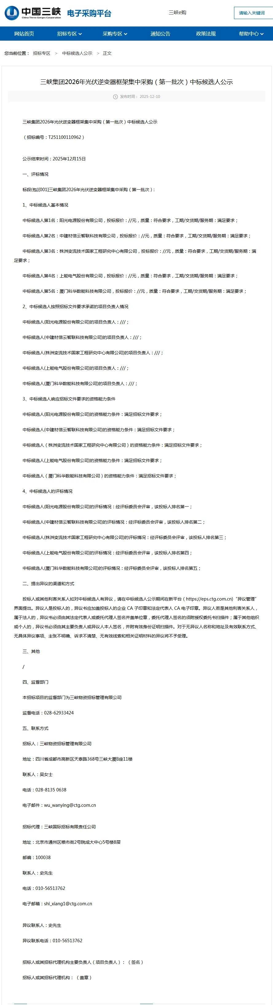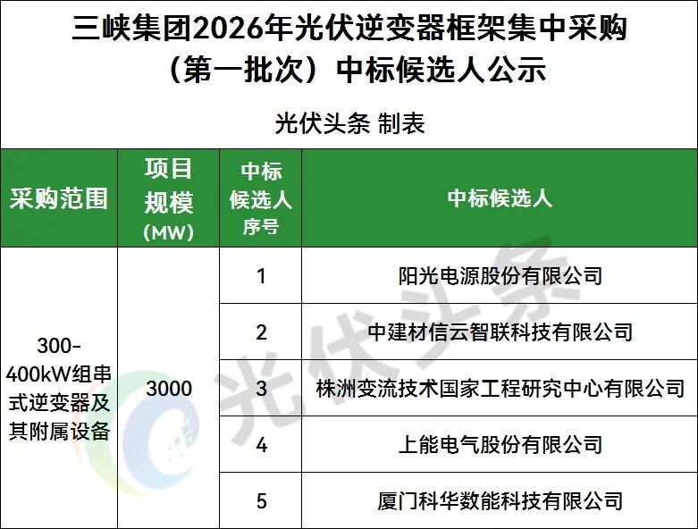 光伏头条获悉,12月10日,三峡集团2026年光伏逆变器框架集中采购(第一批次)中标候选人公示。