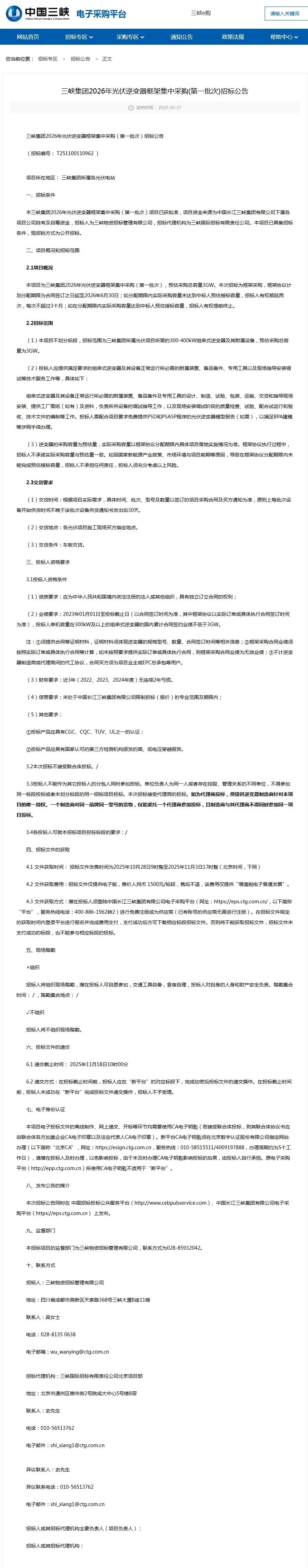 10月27日,三峡集团2026年光伏逆变器框架集中采购(第一批次)项目招标公告发布。(详见:三峡2026年光伏组件(2.5GW)、逆变器(3GW)、固定支架(2.5GW)框采招标!)