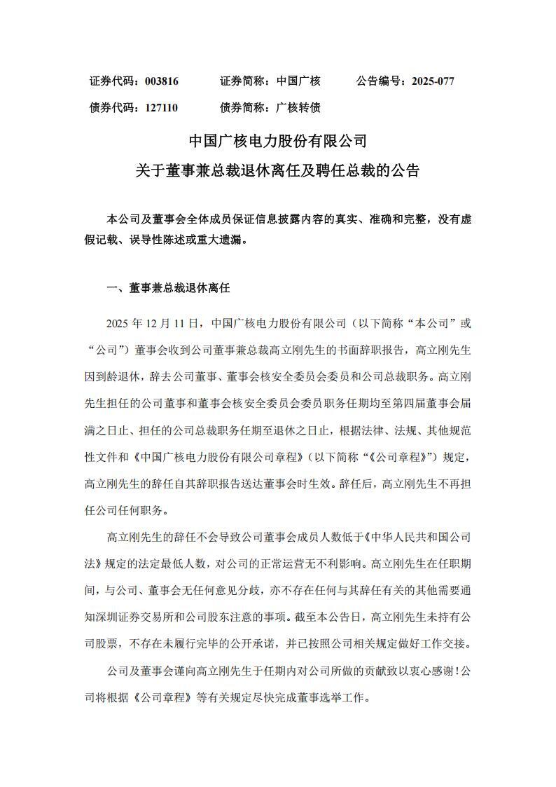 公告指出,2025年12月11日,中国广核电力股份有限公司(以下简称“本公司”或“公司”)董事会收到公司董事兼总裁高立刚先生的书面辞职报告,高立刚先生因到龄退休,辞去公司董事、董事会核安全委员会委员和公司总裁职务。
