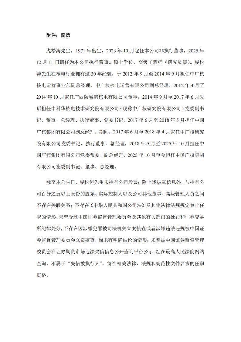 庞松涛,男,1971年出生,硕士学位,高级工程师(研究员级)。2023年10月起任本公司非执行董事,2025年12月11日调任为本公司执行董事。庞松涛先生在核电行业拥有逾30年经验,于2012年9月至2014年9月担任中广核核电运营事业部副总经理、中广核核电运营有限公司副总经理,2012年4月至2014年10月兼任广西防城港核电有限公司董事,2014年9月至2017年6月先后担任中科华核电技术研究院有限公司(现称中广核研究院有限公司)党委副书记、董事、总经理、执行董事、党委书记,2017年6月至2018年5月担任中国广核集团有限公司副总经理,期间,2017年6月至2018年4月兼任中广核研究院有限公司党委书记、执行董事、总经理,2018年5月至2025年10月担任中国广核集团有限公司党委常委、副总经理,2025年10月至今担任中国广核集团有限公司党委副书记、董事、总经理。