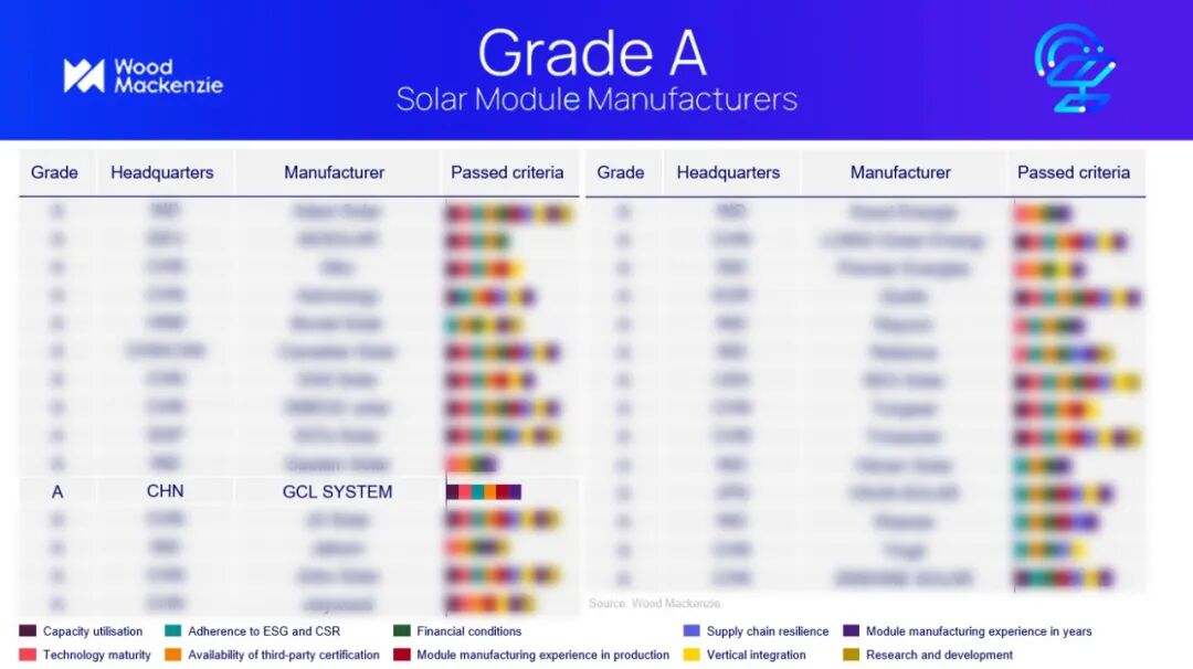 伍德麦肯兹的排名以独立、严谨著称,是全球光伏行业投资与采购决策的关键依据。今年报告首次引入的“A级”(Grade A)分类,聚焦企业的运营卓越性、银行可融资性及长期可靠履约能力,旨在甄选全球制造标杆。全球仅29家企业入选,协鑫集成位列其中。