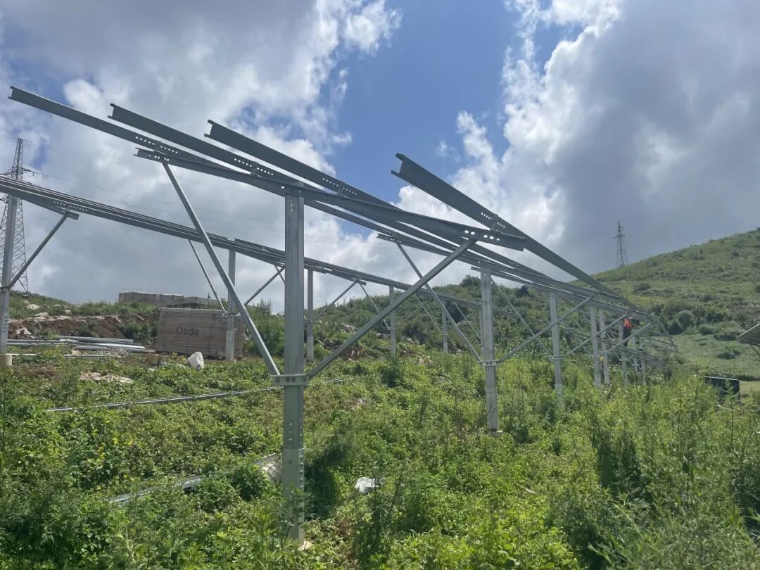 传统山地光伏支架结构为保障结构稳定,往往需从钢材等级、截面尺寸、钢材厚度等方面加强,并增设大量辅助构件,导致结构复杂、用钢量大、安装繁琐、成本升高。本项目在传统结构基础上进行优化,创新提出山地光伏C型单立柱轻量化简易型支架结构体系。新体系在保障结构稳定的前提下,简化了形式、减少了钢材用量,提高了安装效率,累计节约钢材约300吨,缩短工期近1个月。