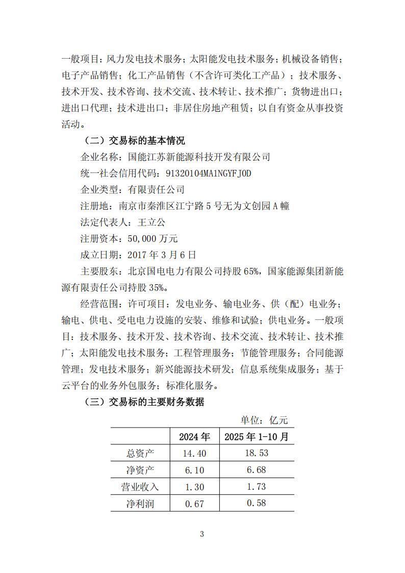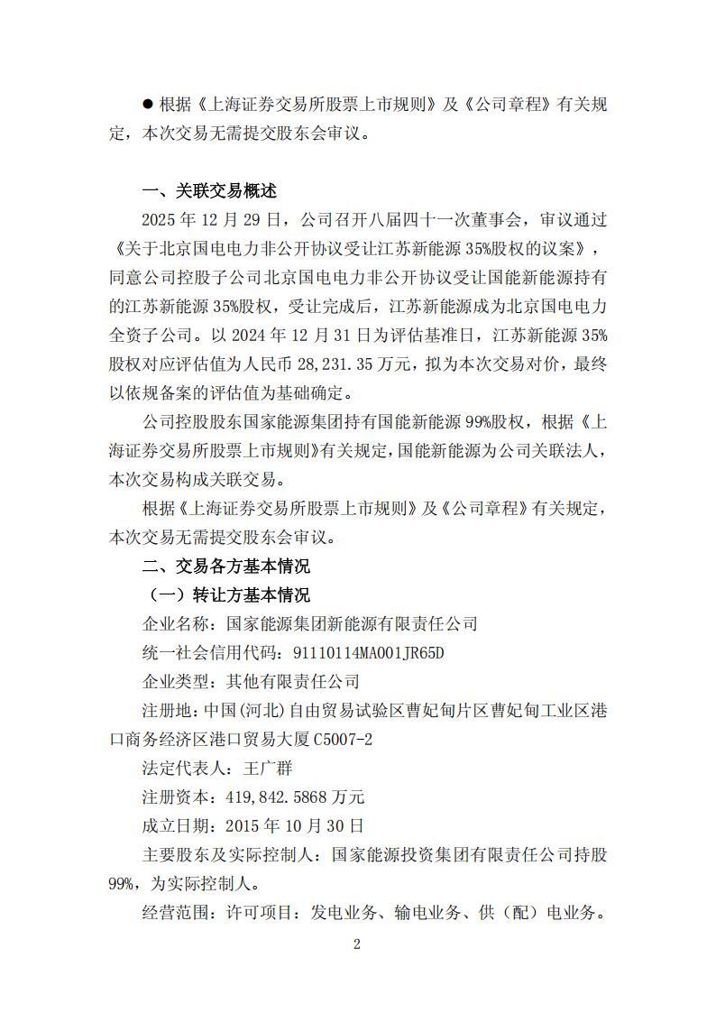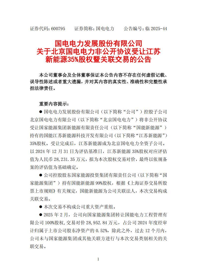 公告显示,国电电力控股子公司北京国电电力有限公司将非公开协议受让国家能源集团新能源有限责任公司持有的国能江苏新能源科技开发有限公司35%股权。受让完成后,江苏新能源成为北京国电电力全资子公司。以 2024 年 12 月 31 日为评估基准日,江苏新能源 35%股权对应评估值为人民币 28,231.35 万元,拟为本次股权交易对价,最终以依规备案的评估值为基础确定。