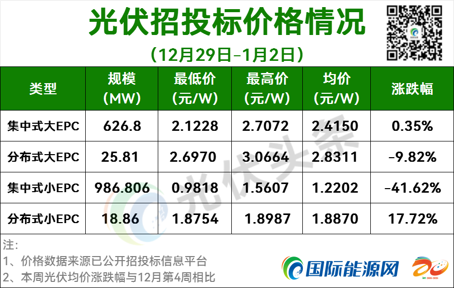 光伏头条根据12月29日至1月2日光伏EPC市场情况,精选展示最高价以及最低价项目。