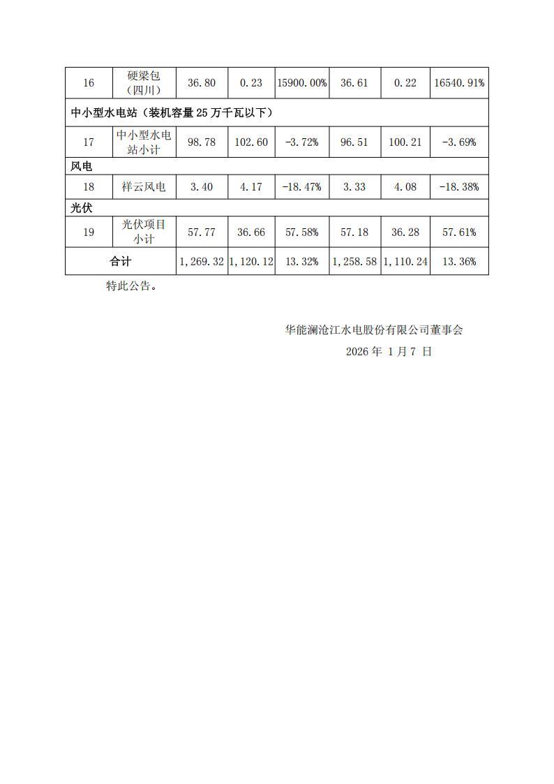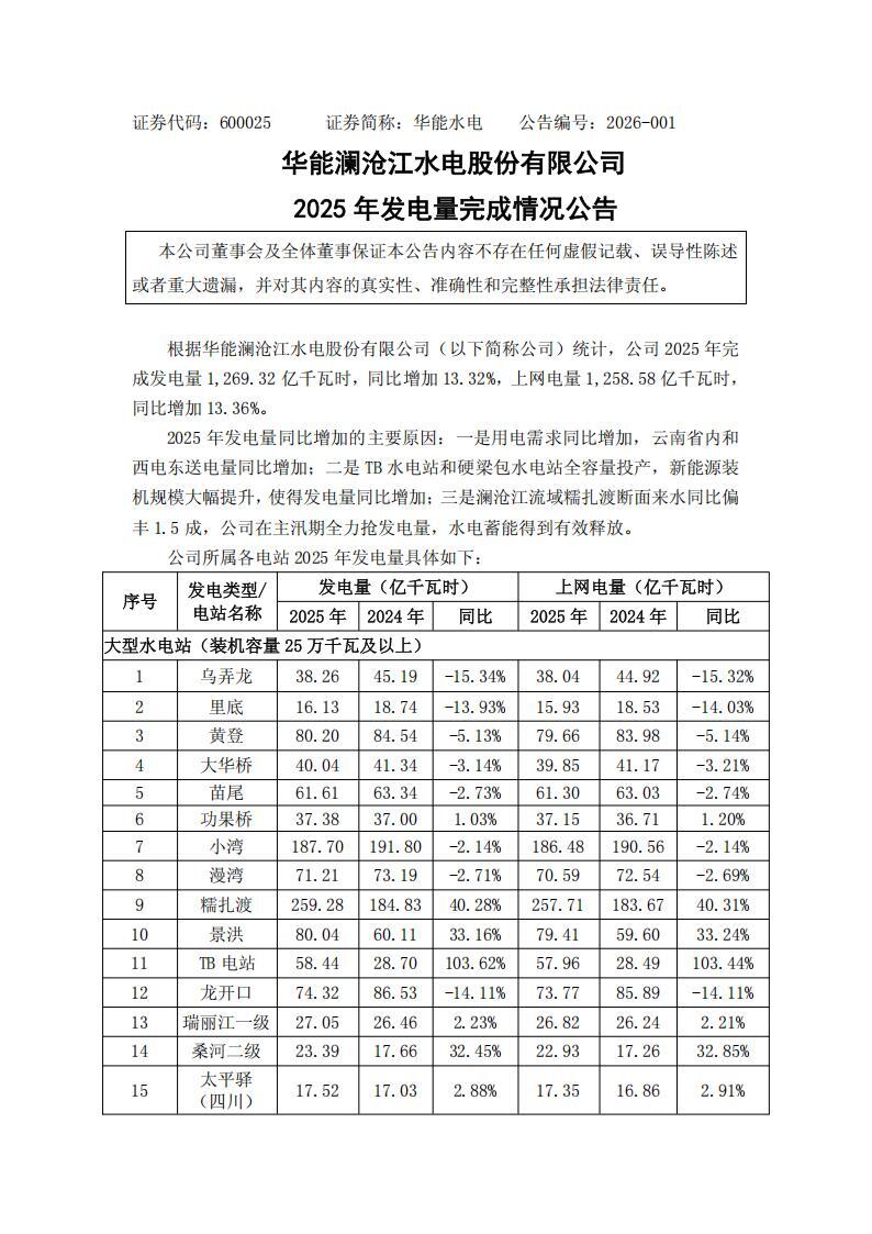 1月7日,华能水电发布2025年发电量完成情况公告。