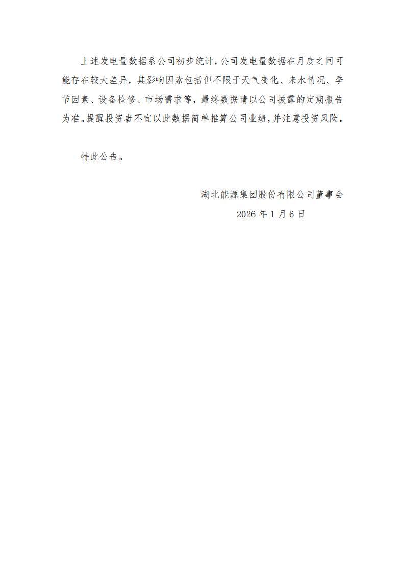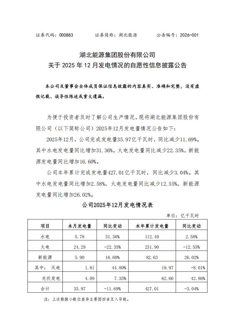 1月7日,湖北能源发布关于2025年12月发电情况的自愿性信息披露公告。