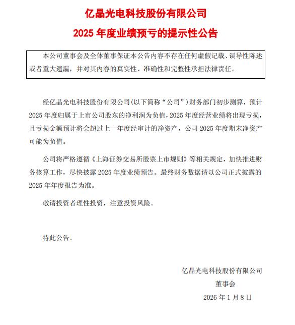 1月8日,亿晶光电发布2025年度业绩预亏的提示性公告。