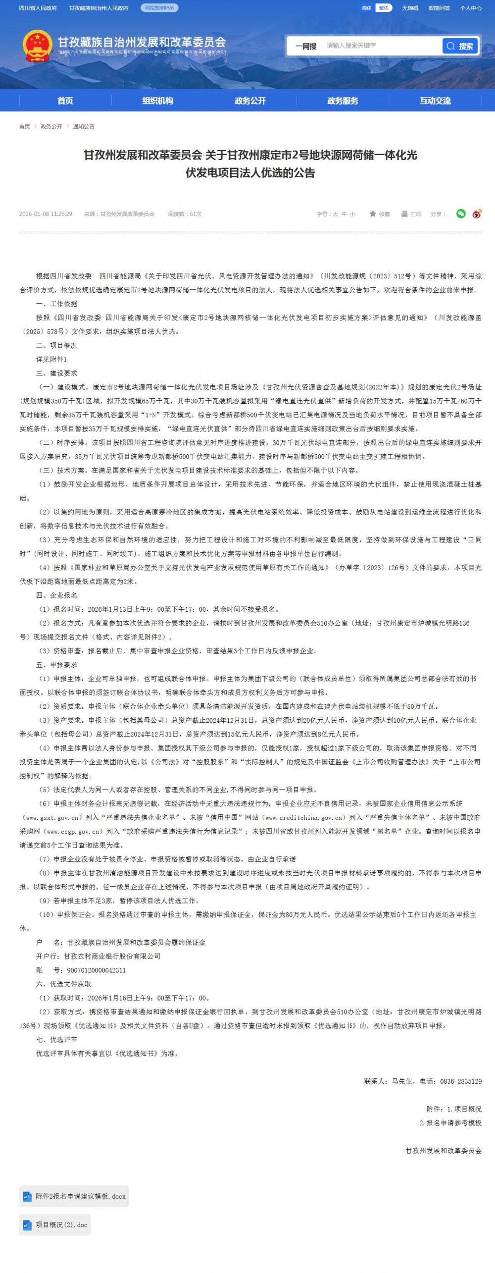 1月8日,四川省甘孜州发展和改革委员会 关于甘孜州康定市2号地块源网荷储一体化光伏发电项目法人优选的公告发布。