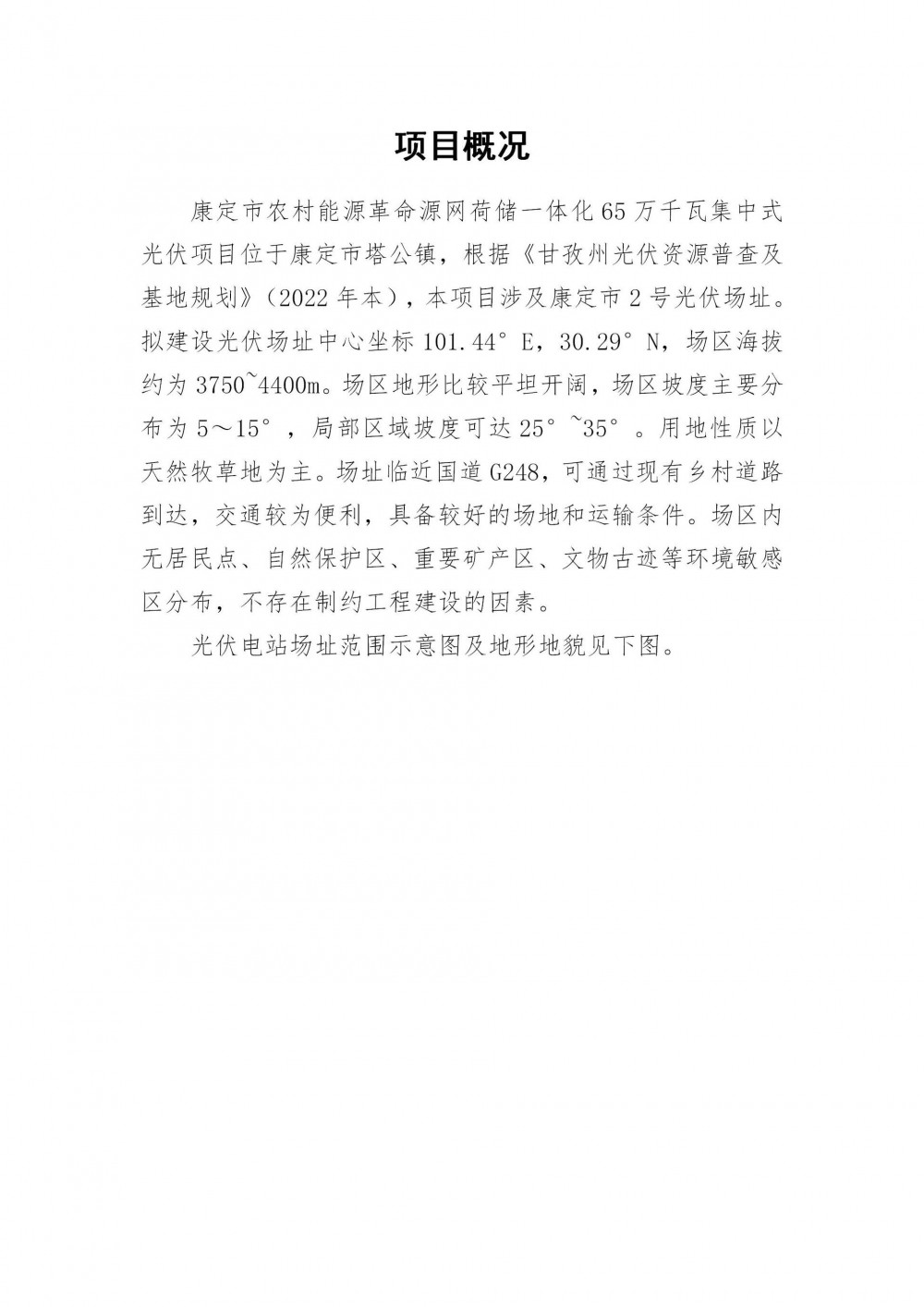 康定市2号地块源网荷储一体化光伏发电项目场址涉及《甘孜州光伏资源普查及基地规划(2022年本)》规划的康定光伏2号场址(规划规模350万千瓦)区域,拟开发规模65万千瓦,其中30万千瓦装机容量拟采用“绿电直连光伏直供”新增负荷的开发方式,并配置15万千瓦/60万千瓦时储能,剩余35万千瓦装机容量采用“1+N”开发模式。综合考虑新都桥500千伏变电站已汇集电源情况及当地负荷水平情况,目前项目暂不具备全部实施条件,本项目暂按35万千瓦规模安排实施,“绿电直连光伏直供”部分待四川省绿电直连实施细则政策出台后按细则要求实施。