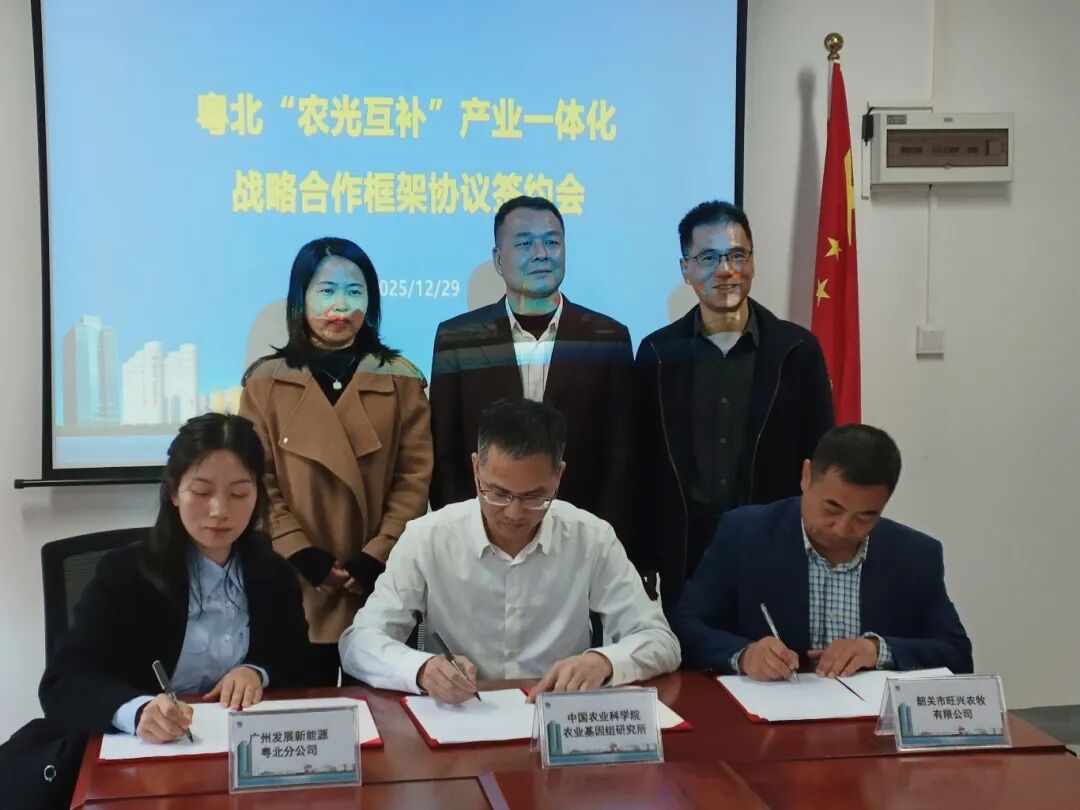 12月29日,新能源粤北分公司举行“农光互补”产业一体化战略合作签约仪式,韶关市武江区工信局、农业局到场见证。广州发展新能源粤北分公司、中国农科院基因组研究所、韶关市旺兴农牧有限公司三方签约合作,携手打造粤北“板上发电+板下种养循环”产业新模式。