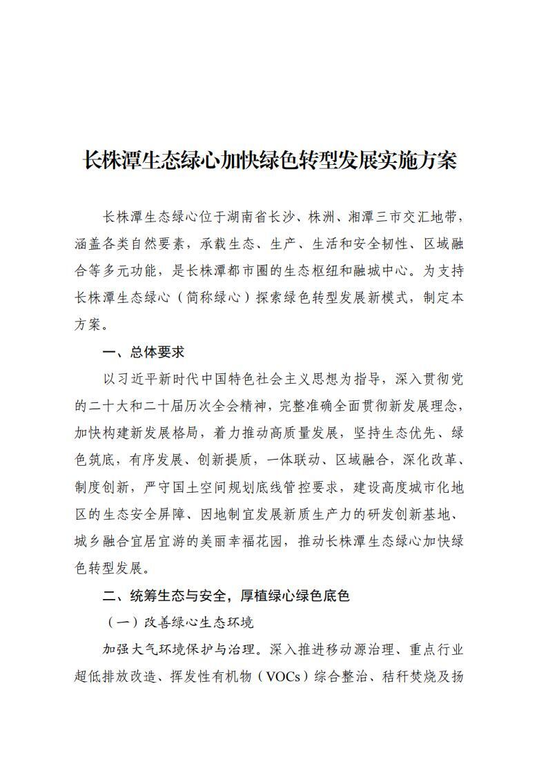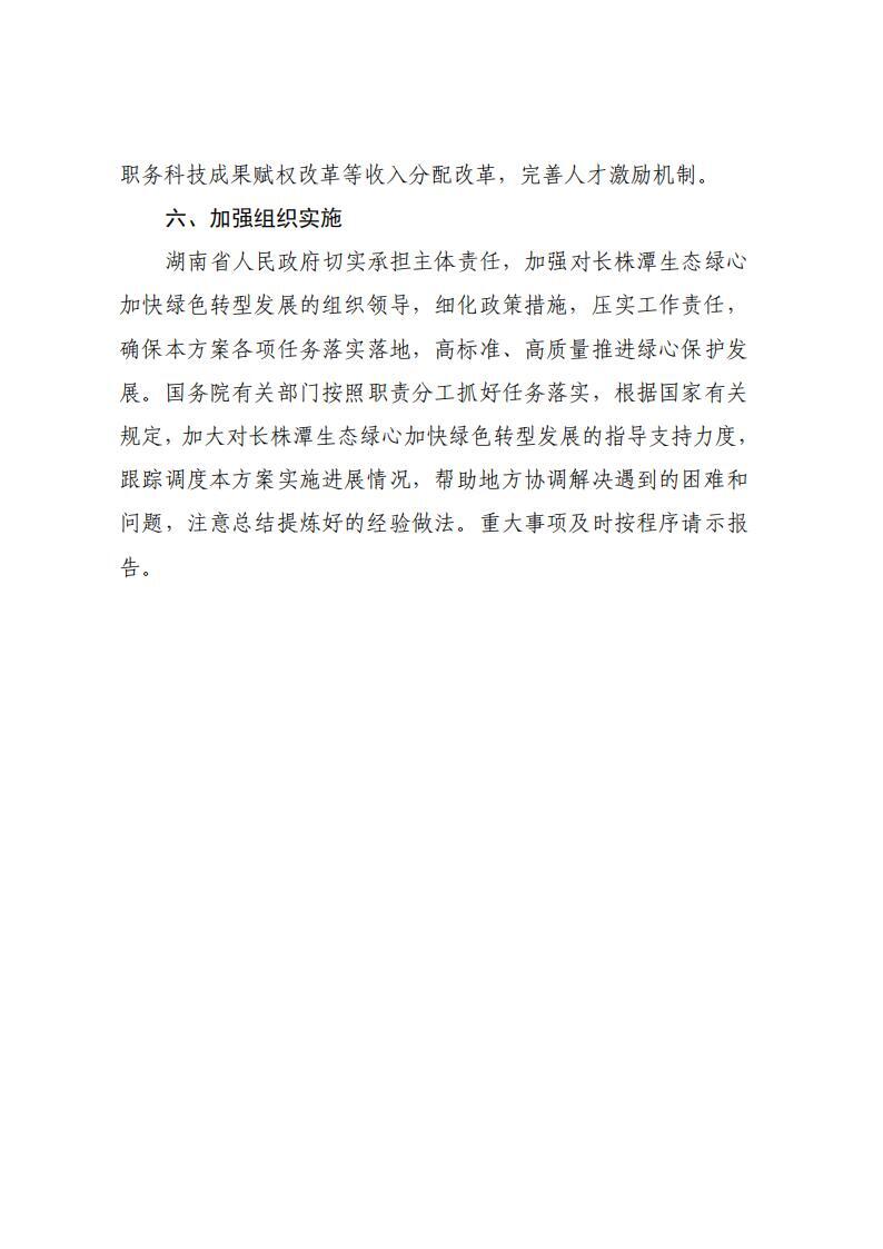 《长株潭生态绿心加快绿色转型发展实施方案》已经国务院同意,现印发给你们。湖南省要认真抓好落实,确保如期完成各项目标任务。国务院有关部门要按照职责分工,对长株潭生态绿心探索绿色转型发展新模式做好指导支持。